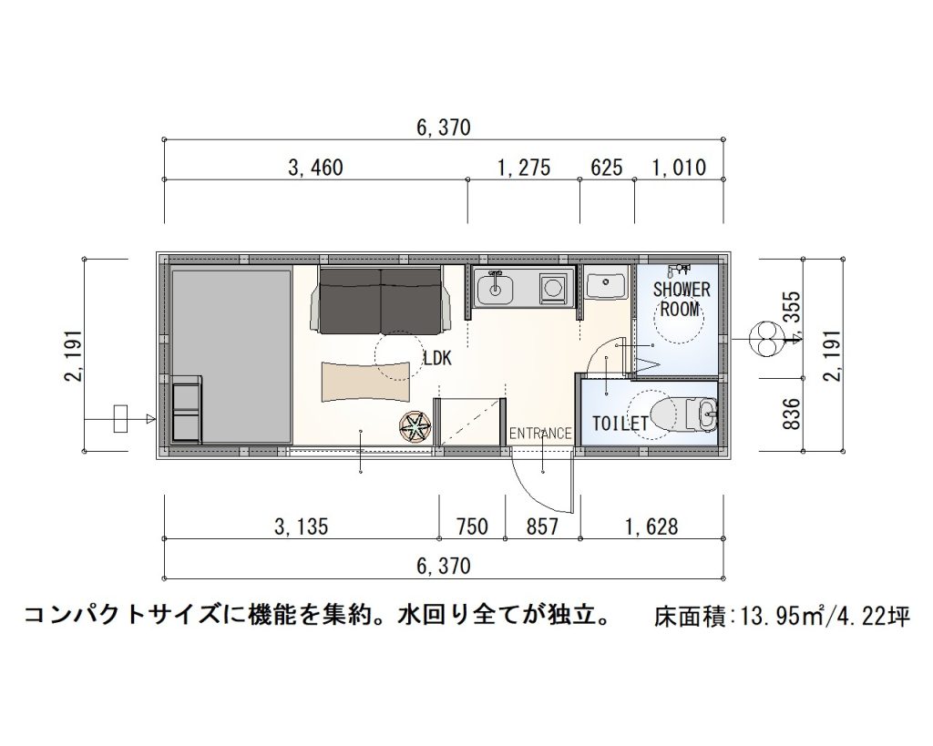 コンパクトなサイズに機能を集約し、水廻りがすべて独立したコンテナハウス。
